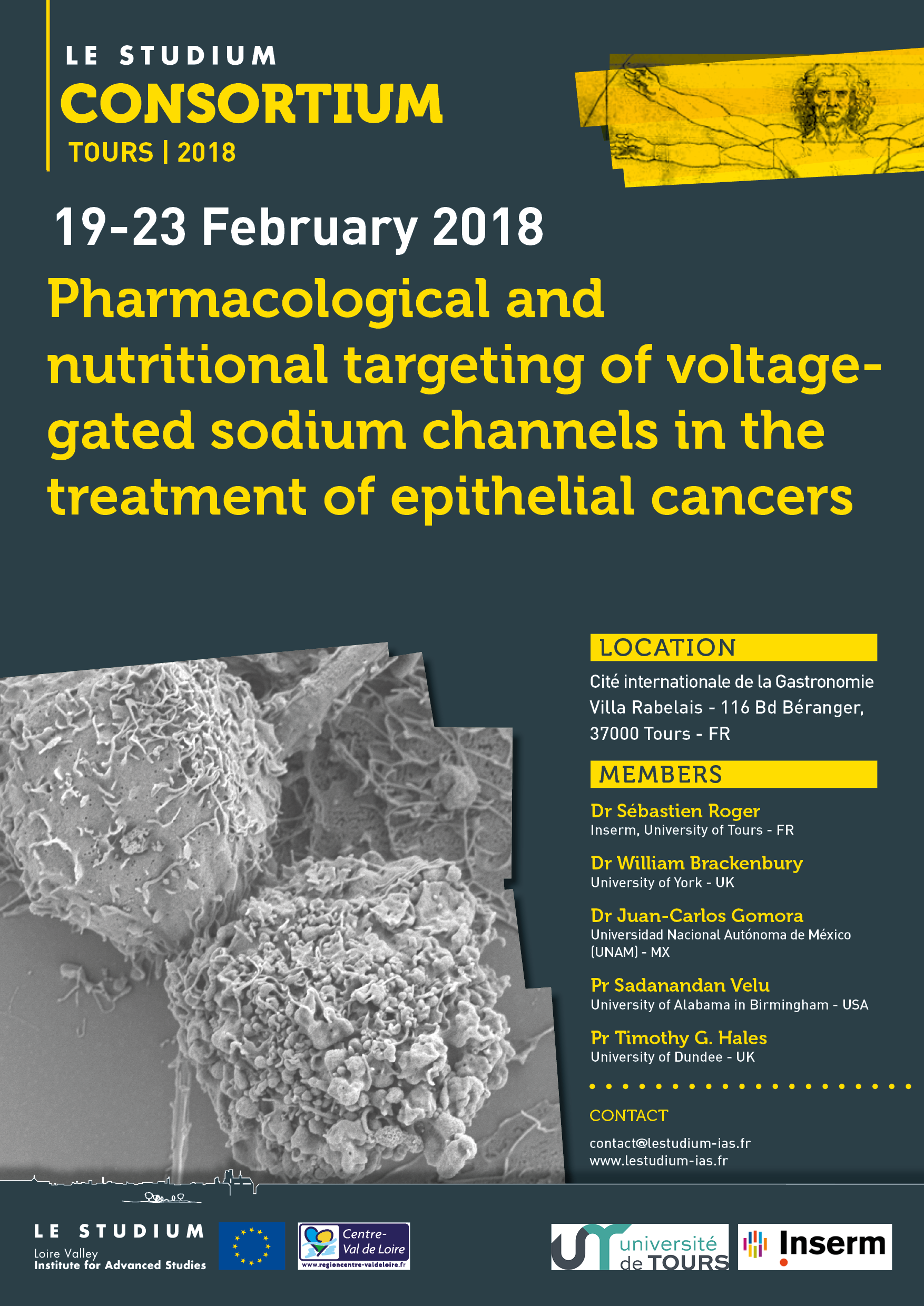 Voltage-gated sodium channels (NaV), composed of pore-forming alpha and auxiliary beta subunits, were characterized in excitable cells in which they are responsible for the triggering of action potentials. Their activity in nociceptive fibres is responsible for pain sensation. Recently, it appeared that these proteins are aberrantly expressed in non-excitable cancer tissues and cells from different epithelial origins such as breast, lung, prostate, colon, cervix, while they are not expressed in cognate non-cancer tissues. Their expression and function in carcinoma cells have been associated with cancer progression towards metastatic stages and patients’ death. The basal activity of NaV at the resting membrane potential of highly aggressive human carcinoma cells, controls intracellular signalling pathways that promote cell migration and invasiveness through extracellular matrices. The pharmacological inhibition of NaV with drugs that are clinically used, such as the antianginal ranolazine, the anticonvulsant phenytoin or the local anaesthetic lidocaine, reduces cancer cell invasion in vitro and metastatic colonization of organs in vivo. The supplementation of cancer cells with n-3 polyunsaturated fatty acids was also demonstrated to control the expression of NaV in cancer cells and to inhibit their invasiveness. The present collaborative project is a multidisciplinary project, joining concepts and techniques from cell biology, physiology, biophysics, medicinal chemistry, anaesthesia, surgery and oncology. This consortium aims at developing a better understanding of molecular and cellular mechanisms by which NaV channels (pore-forming and auxiliary subunits) are involved in cancer cell invasiveness and metastases development and at identifying whether they could serve as cancer markers and prognostic factors. It is also aimed at proposing NaV as new pharmacological and nutritional targets for anticancer treatments and for reducing cancer-associated pain.