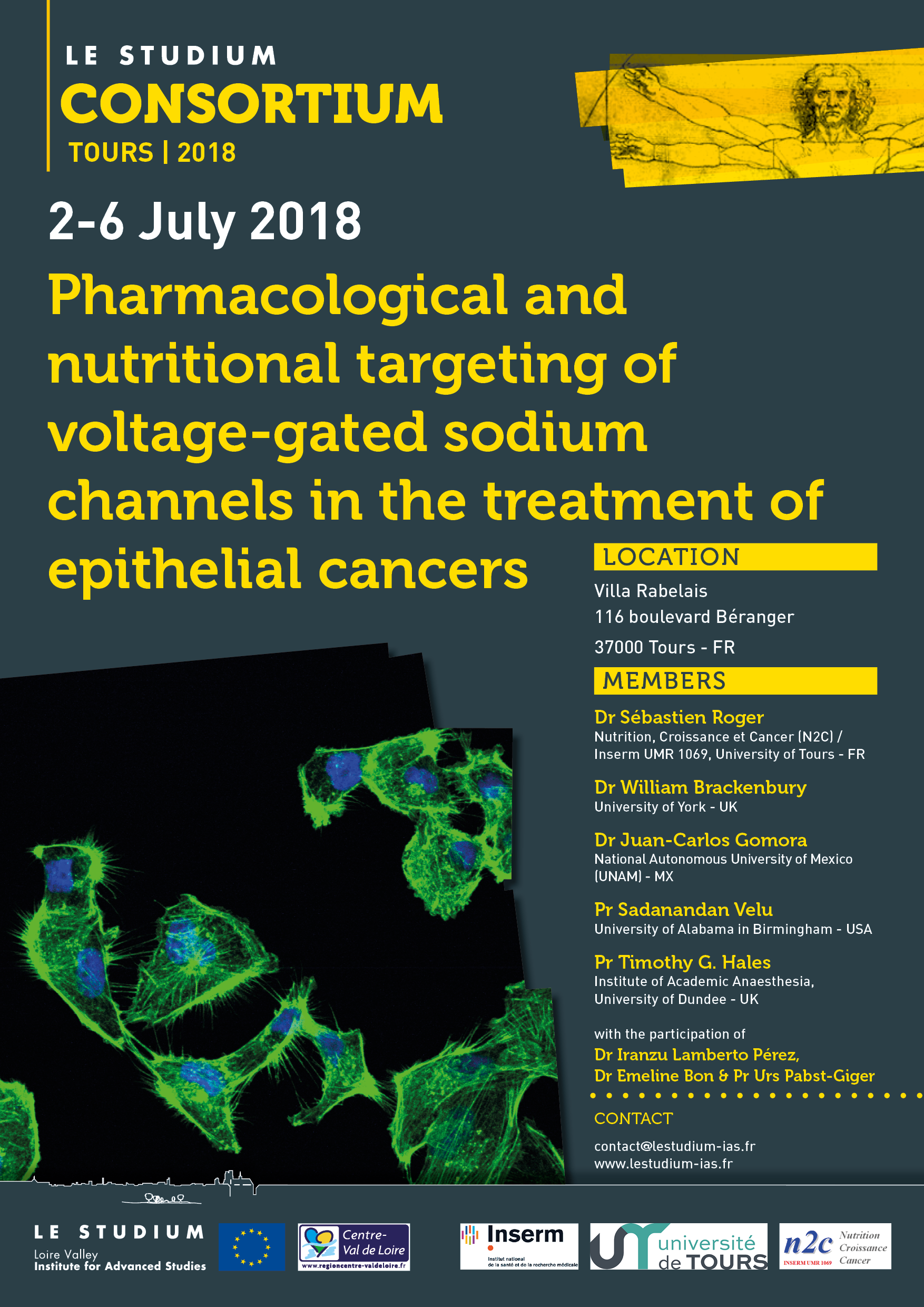 Voltage-gated sodium channels (NaV), composed of pore-forming alpha and auxiliary beta subunits, were characterized in excitable cells in which they are responsible for the triggering of action potentials. Their activity in nociceptive fibres is responsible for pain sensation. Recently, it appeared that these proteins are aberrantly expressed in non-excitable cancer tissues and cells from different epithelial origins such as breast, lung, prostate, colon, cervix, while they are not expressed in cognate non-cancer tissues. Their expression and function in carcinoma cells have been associated with cancer progression towards metastatic stages and patients’ death. The basal activity of NaV at the resting membrane potential of highly aggressive human carcinoma cells, controls intracellular signalling pathways that promote cell migration and invasiveness through extracellular matrices. The pharmacological inhibition of NaV with drugs that are clinically used, such as the antianginal ranolazine, the anticonvulsant phenytoin or the local anaesthetic lidocaine, reduces cancer cell invasion in vitro and metastatic colonization of organs in vivo. The supplementation of cancer cells with n-3 polyunsaturated fatty acids was also demonstrated to control the expression of NaV in cancer cells and to inhibit their invasiveness. The present collaborative project is a multidisciplinary project, joining concepts and techniques from cell biology, physiology, biophysics, medicinal chemistry, anaesthesia, surgery and oncology. This consortium aims at developing a better understanding of molecular and cellular mechanisms by which NaV channels (pore-forming and auxiliary subunits) are involved in cancer cell invasiveness and metastases development and at identifying whether they could serve as cancer markers and prognostic factors. It is also aimed at proposing NaV as new pharmacological and nutritional targets for anticancer treatments and for reducing cancer-associated pain.
