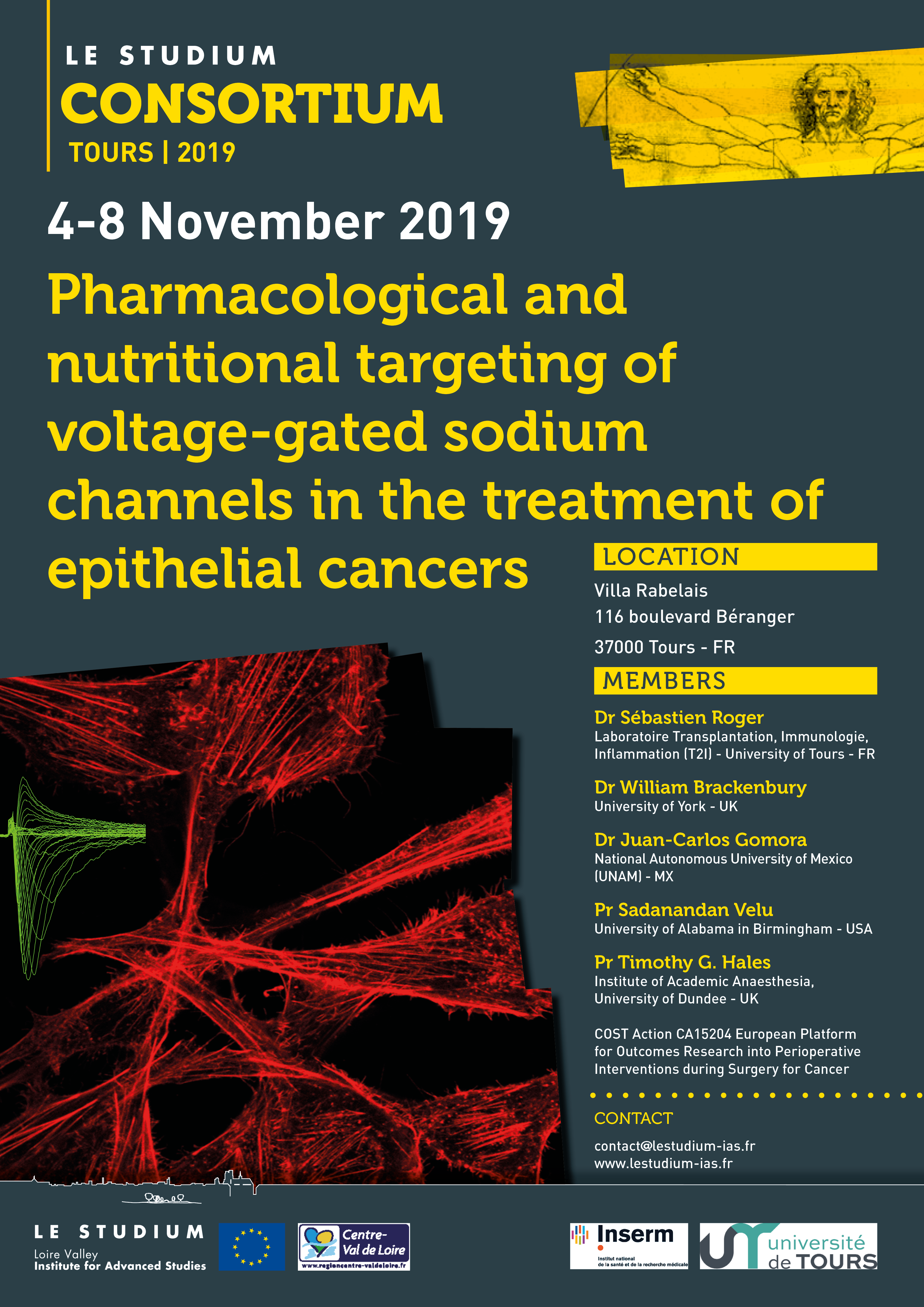 Voltage-gated sodium channels (NaV), composed of pore-forming alpha and auxiliary beta subunits, were characterized in excitable cells in which they are responsible for the triggering of action potentials. Their activity in nociceptive fibres is responsible for pain sensation. Recently, it appeared that these proteins are aberrantly expressed in non-excitable cancer tissues and cells from different epithelial origins such as breast, lung, prostate, colon, cervix, while they are not expressed in cognate non-cancer tissues. Their expression and function in carcinoma cells have been associated with cancer progression towards metastatic stages and patients’ death. The basal activity of NaV at the resting membrane potential of highly aggressive human carcinoma cells, controls intracellular signalling pathways that promote cell migration and invasiveness through extracellular matrices. The pharmacological inhibition of NaV with drugs that are clinically used, such as the antianginal ranolazine, the anticonvulsant phenytoin or the local anaesthetic lidocaine, reduces cancer cell invasion in vitro and metastatic colonization of organs in vivo. The supplementation of cancer cells with n-3 polyunsaturated fatty acids was also demonstrated to control the expression of NaV in cancer cells and to inhibit their invasiveness. The present collaborative project is a multidisciplinary project, joining concepts and techniques from cell biology, physiology, biophysics, medicinal chemistry, anaesthesia, surgery and oncology. This consortium aims at developing a better understanding of molecular and cellular mechanisms by which NaV channels (pore-forming and auxiliary subunits) are involved in cancer cell invasiveness and metastases development and at identifying whether they could serve as cancer markers and prognostic factors. It is also aimed at proposing NaV as new pharmacological and nutritional targets for anticancer treatments and for reducing cancer-associated pain.